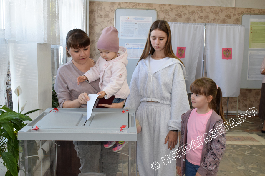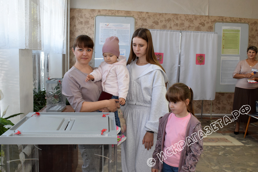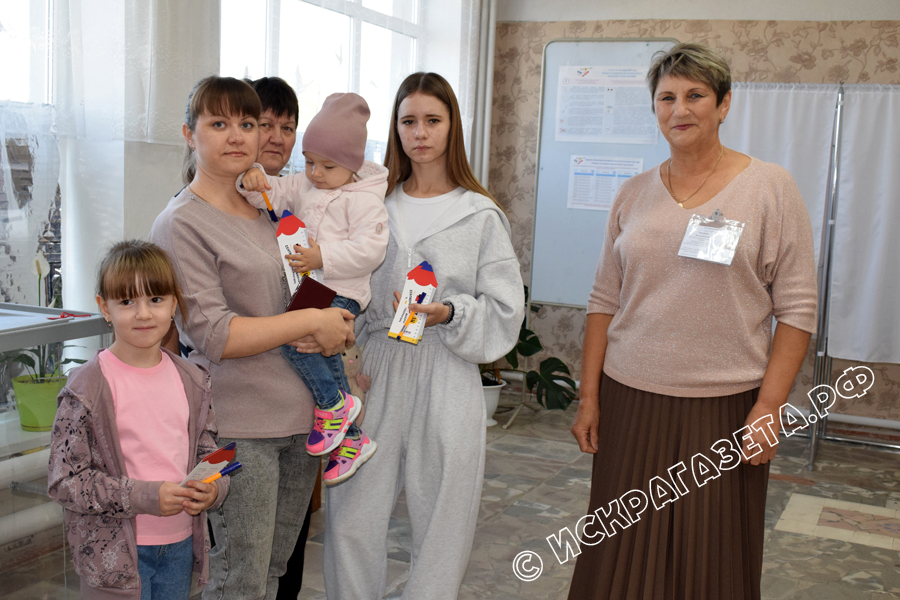 Многодетная мама Елена вместе с дочками Дианой, Миланой, Ульяной и бабушкой Раисой Горшениной из х.Заикинского пришли на участок № 393, чтобы выразить свою гражданскую позицию. Елена добавила, что это ещё и традиция в их семье — они многое делают вместе, поэтому совместный поход на избирательный участок считают важным и ответственным событием.