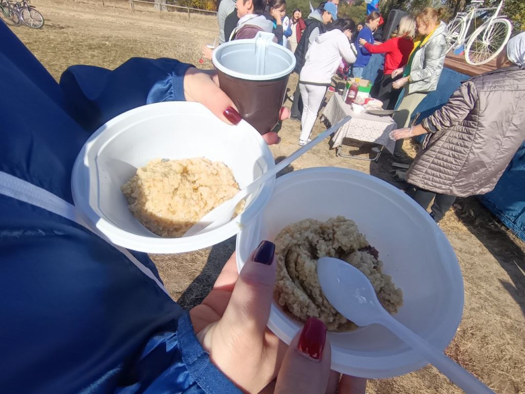 Финишировали участники велопробега на лугу ниже мельницы, где для них были организованы торжественная встреча с музыкальными номерами от Ю.Дзагоева и М.Шишикиной и полевая кухня от работников библиотеки, которая позволила спортсменам подкрепится мясной рассыпчатой кашей, сдобными румяными пирожками и горячим чаем на травах из самовара.