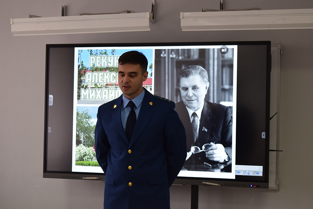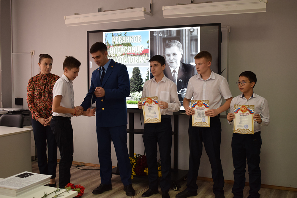 Его деятельность оставила добрый след в сердцах многих людей, а пример служения Закону вдохновляет до сих пор и учит идти вперед к великим свершениям. О славном пути А.М.Рекункова с учащимися гимназии в этот день поговорили заведующий отдела образования района Л.Матвеева и заместитель прокурора района И.Казинцев. После встречи, посвященной юбилею бывшего ученика, чье имя носит образовательное учреждение, почетные гости вместе с гимназистами возложили венок и цветы к бюсту прокурора Советского Союз А.Рекункова, установленного во дворе гимназии в мае 2013 года.