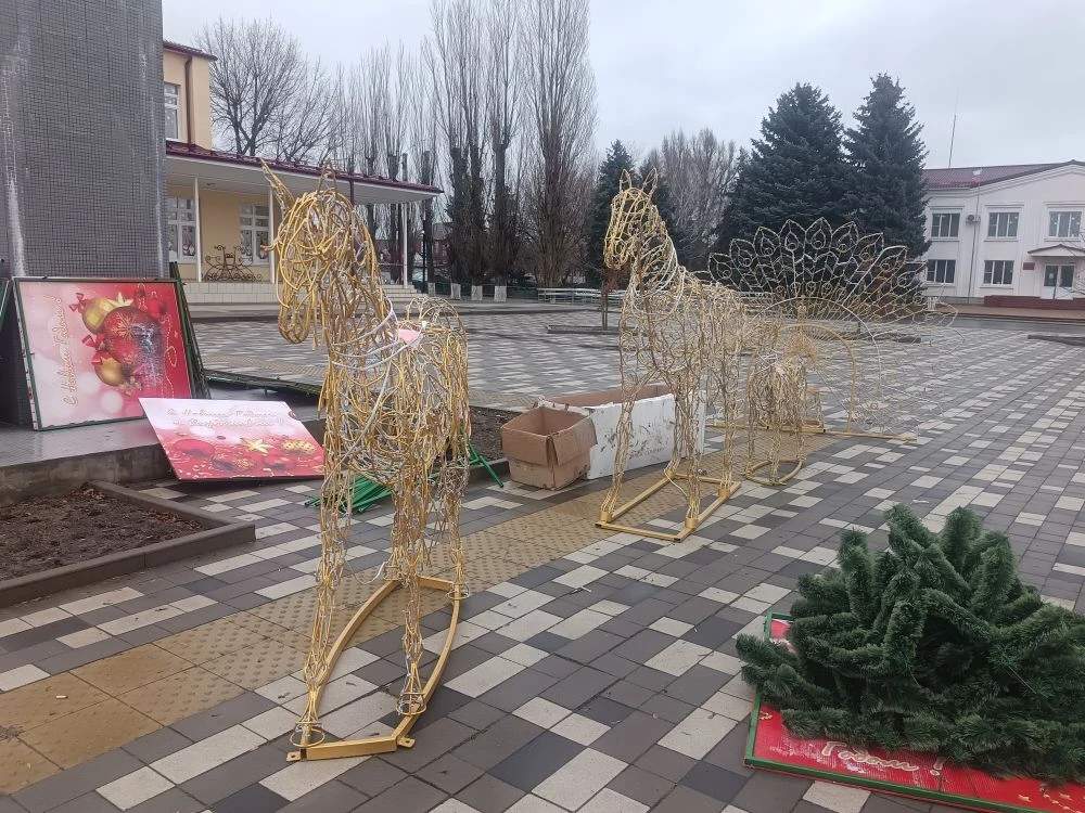 Работа вот уже второй день кипит с самого утра и напоминает слаженный праздничный конвейер. Пока работники монтируют прочный каркас и собирали пушистые ветви, к делу подключились сотрудницы администрации Казанского сельского поселения. Аккуратно, будто драгоценности, они достают из коробок огромные шары синего, красного и серебристого цветов и размещают их на пушистых еловых лапах. Рядом другая часть коллектива собирает световые фигуры — улыбающегося Снеговика с санями, арку в форме елочной игрушки, лошадей и красавца-павлина, которые составят праздничный ансамбль.