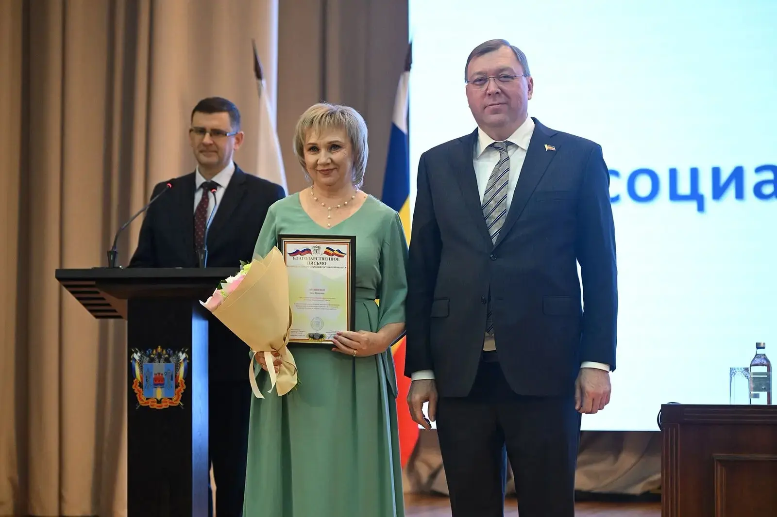 В рамках мероприятия Благодарственным письмом Законодательного собрания Ростовской области за вклад в развитие местного самоуправления была награждена глава Верхняковского сельского поселения А. Литвинова.