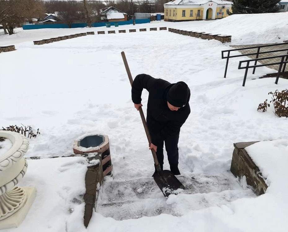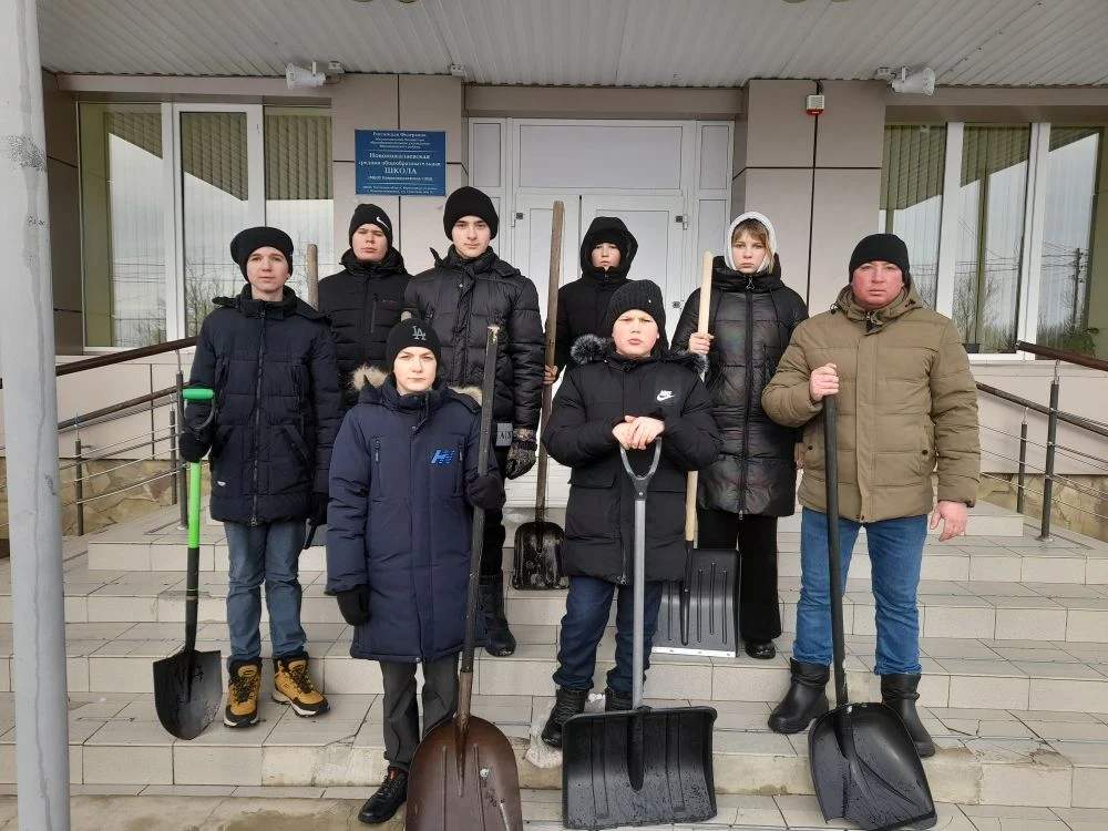 Трудовой десант школьников расчистил от снега памятник воинам в х.Новониколаевский