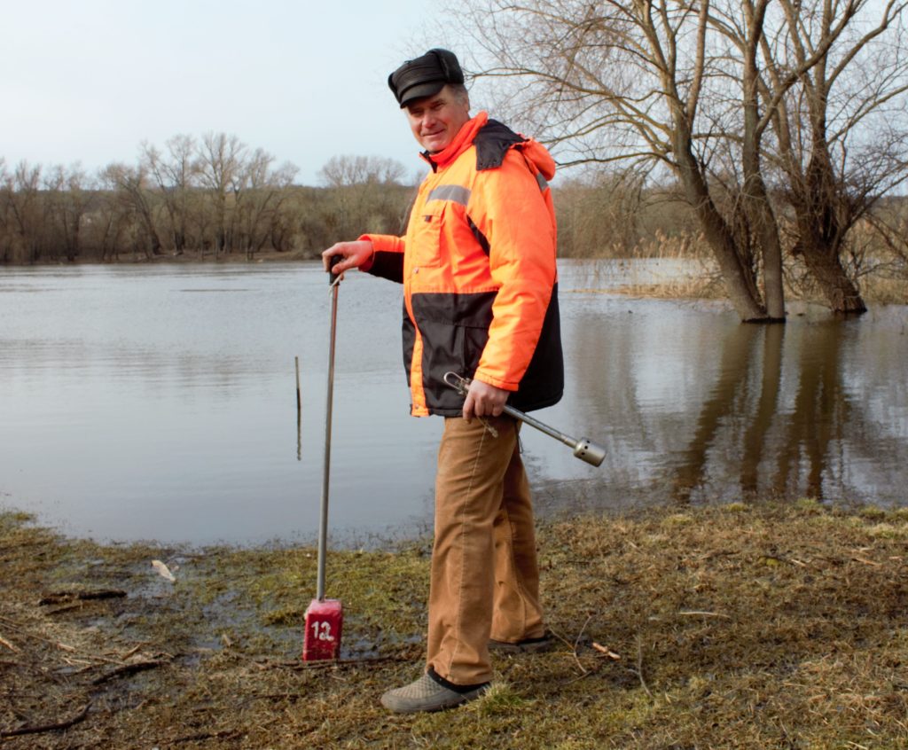 Он отвечает за гидрологические измерения реки Дон. К берегу установлены нивелированные сваи — на них отметки по всемирному стандарту, относительно уровня Балтийского моря. Утром и вечером Иван Васильевич выходит к реке. Ставит рейку на сваю и меряет уровень воды. А после опускает в реку специальный термометр с отверстиями — часть воды остаётся внутри, благодаря чему можно точно измерить температуру. Этим показателем в летнее время больше всего интересуются купальщики.